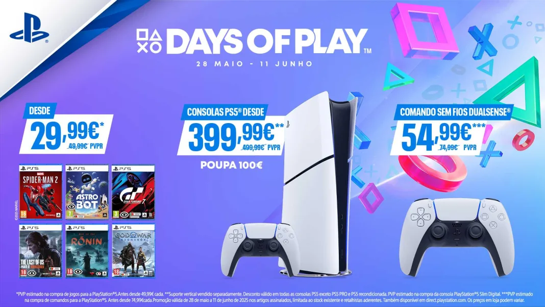 A Sony Interactive Entertainment (SIE) anuncia o regresso dos Days of Play, a maior celebração do ano para a comunidade, com promoções, novos conteúdos, atividades e muito mais. Este é um dos momentos mais aguardados pelos jogadores da plataforma, que durante estas duas semanas poderão aproveitar grandes descontos em jogos e periféricos. Além disso, quem ainda não deu o salto para a nova geração poderá adquirir uma PS5 com 100€ de desconto e embarcar em aventuras incríveis com clássicos e os mais recentes títulos a partir de 29,99€, disponível na PlayStation Direct e nas lojas habituais.